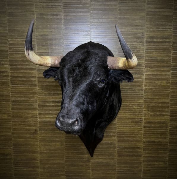 Kracht en Elegantie verenigd: Opgezette Zwarte Spaanse Stier als Kunstzinnig Meesterwerk